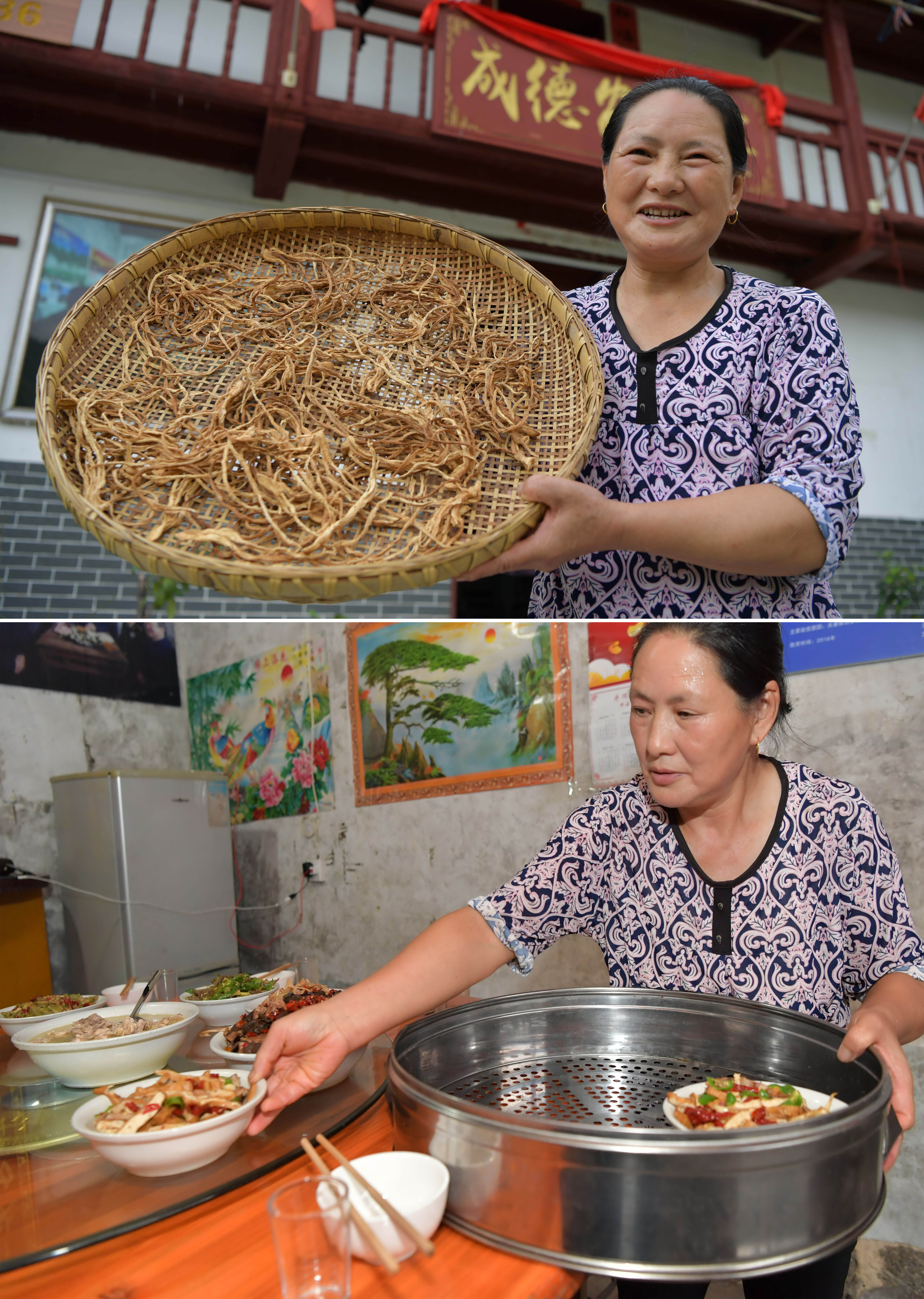 拼版照片:上圖為江西省井岡山市神山村村民彭夏英在自己開(kāi)辦的農(nóng)家樂(lè)內(nèi)展示她家自制的當(dāng)?shù)靥禺a(chǎn);下圖為彭夏英在農(nóng)家樂(lè)內(nèi)給顧客上菜(2020年7月15日攝)。新華社記者 彭昭之 攝