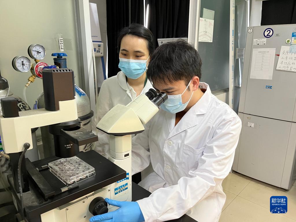 10月20日,廣東中山大學(xué)中山醫(yī)學(xué)院博士研究生張賢濤(右)在實(shí)驗室。新華社發(fā)