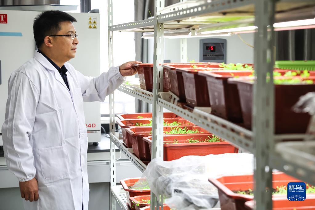 10月20日,貴州大學(xué)動物科學(xué)學(xué)院院長陳超在實(shí)驗室內(nèi)觀察新品種牧草的生長情況。新華社記者 歐東衢 攝