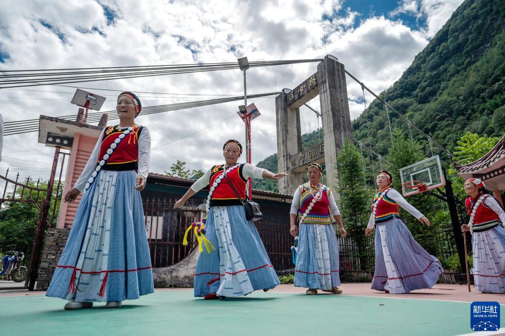 云南省怒江州福貢縣石月亮鄉(xiāng)拉瑪?shù)状宕迕褡园l(fā)組成的“奮進(jìn)合唱團(tuán)”在村委會(huì)排練節(jié)目(2022年9月14日攝)。2020年,怒江州26.96萬貧困人口全部脫貧,249個(gè)貧困村全部出列,4個(gè)貧困縣(市)全部摘帽。新華社記者 江文耀 攝