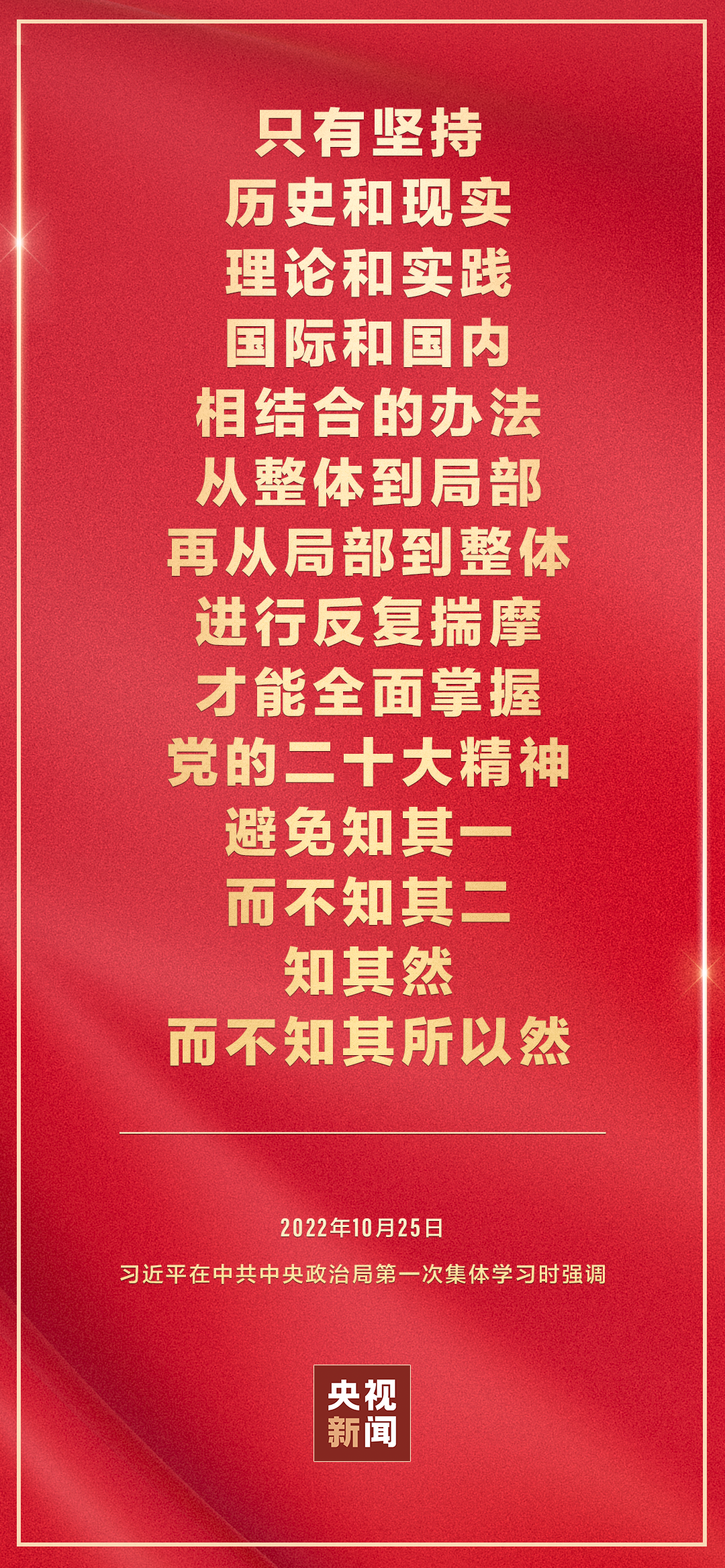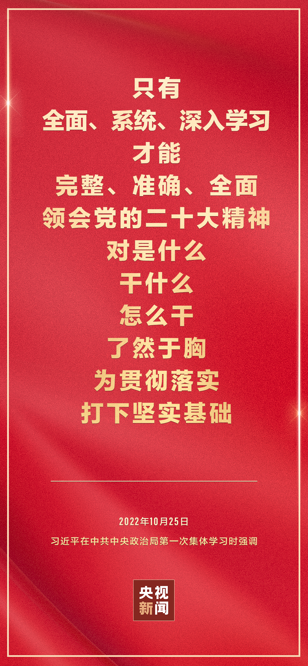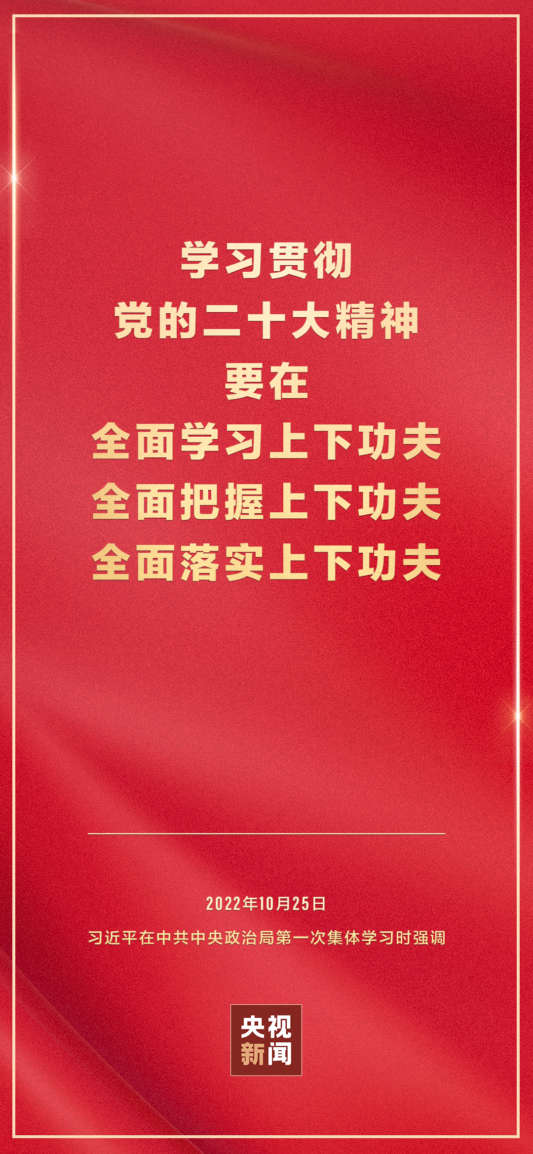 二十屆中共中央政治局10月25日下午就學習貫徹黨的二十大精神進行第一次集體學習。中共中央總書記習近平在主持學習時強調(diào),全黨要在全面學習、全面把握、全面落實上下功夫,堅定不移把黨的二十大提出的目標任務落到實處,奮力奪取全面建設社會主義現(xiàn)代化國家新勝利。