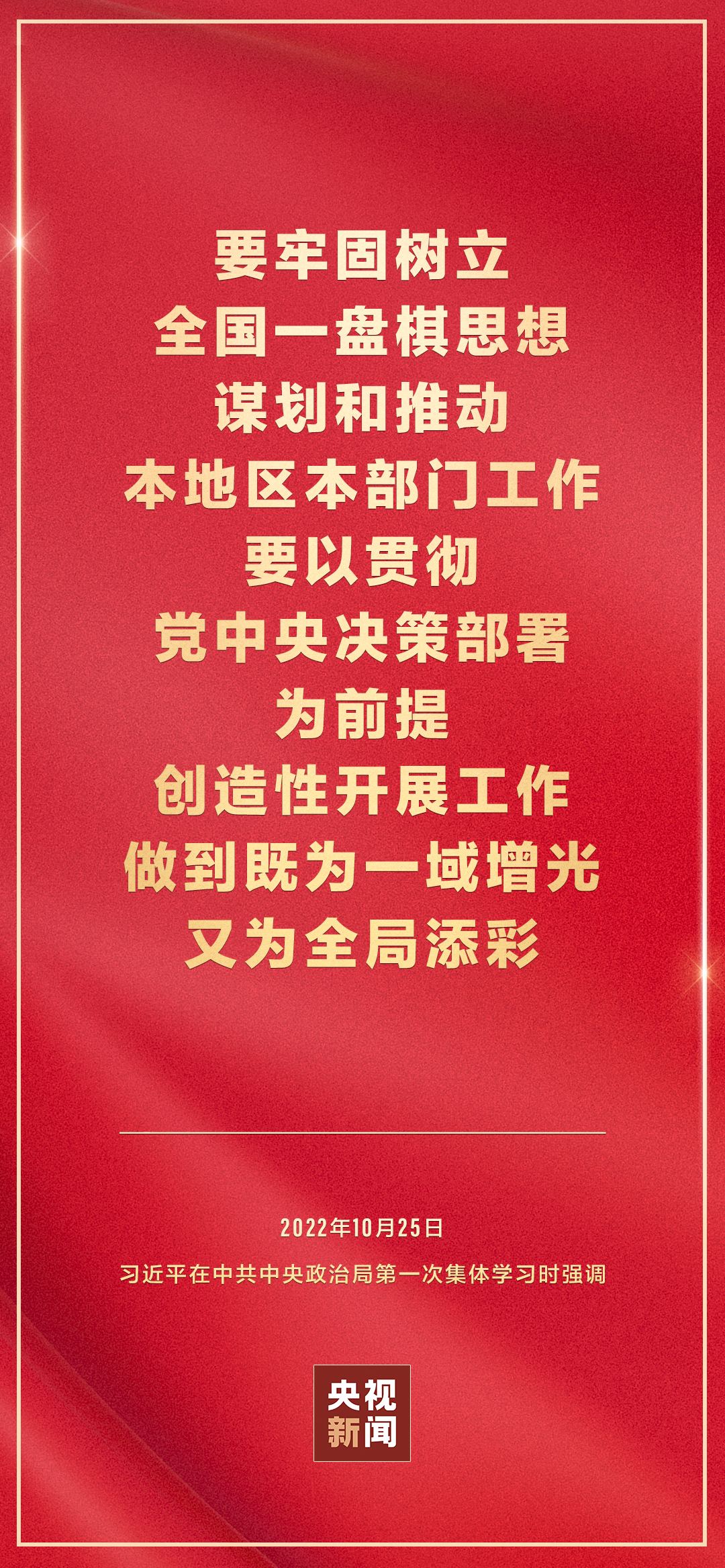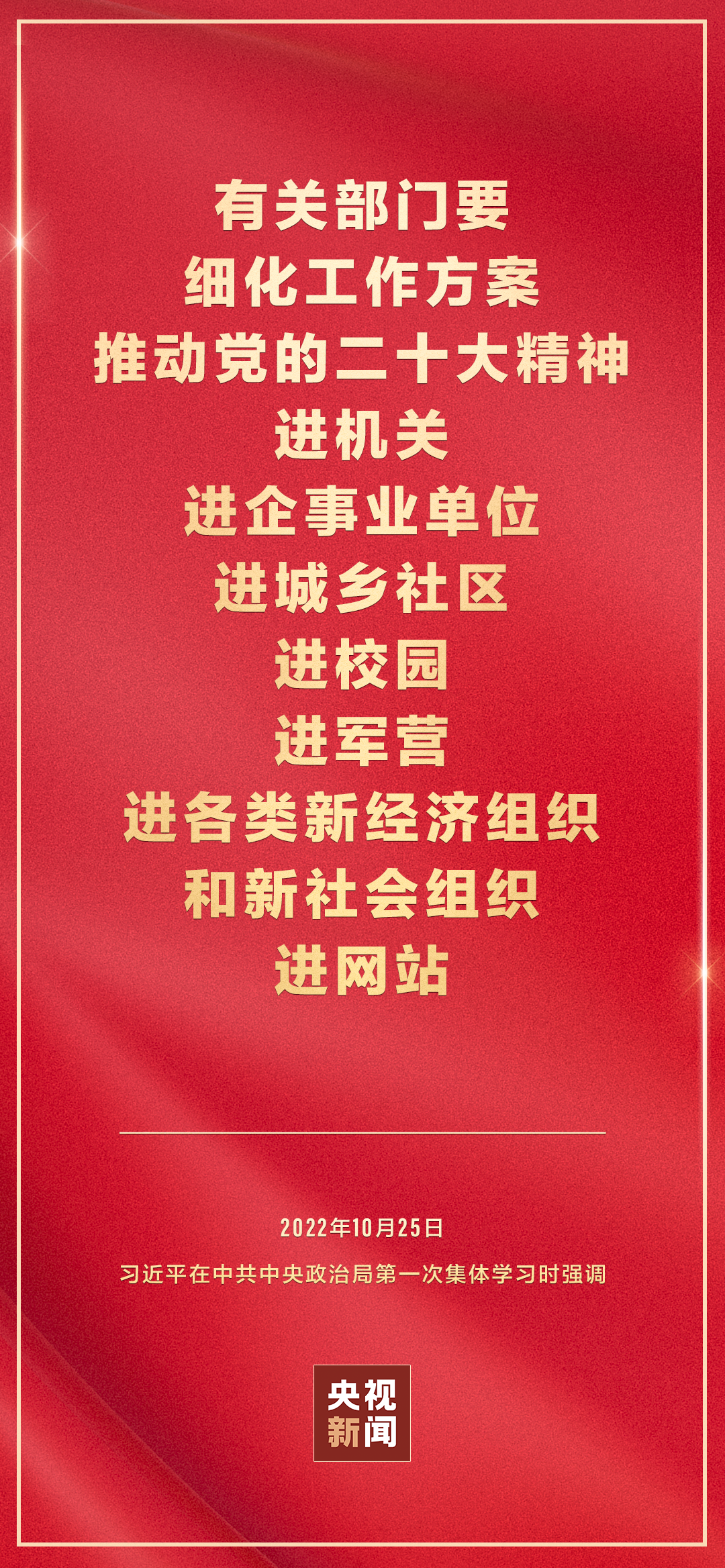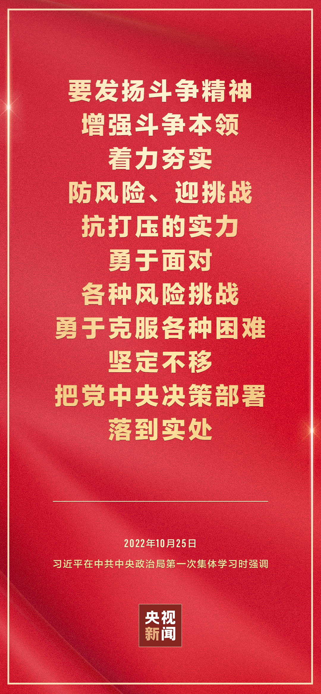 二十屆中共中央政治局10月25日下午就學習貫徹黨的二十大精神進行第一次集體學習。中共中央總書記習近平在主持學習時強調(diào),全黨要在全面學習、全面把握、全面落實上下功夫,堅定不移把黨的二十大提出的目標任務落到實處,奮力奪取全面建設社會主義現(xiàn)代化國家新勝利。