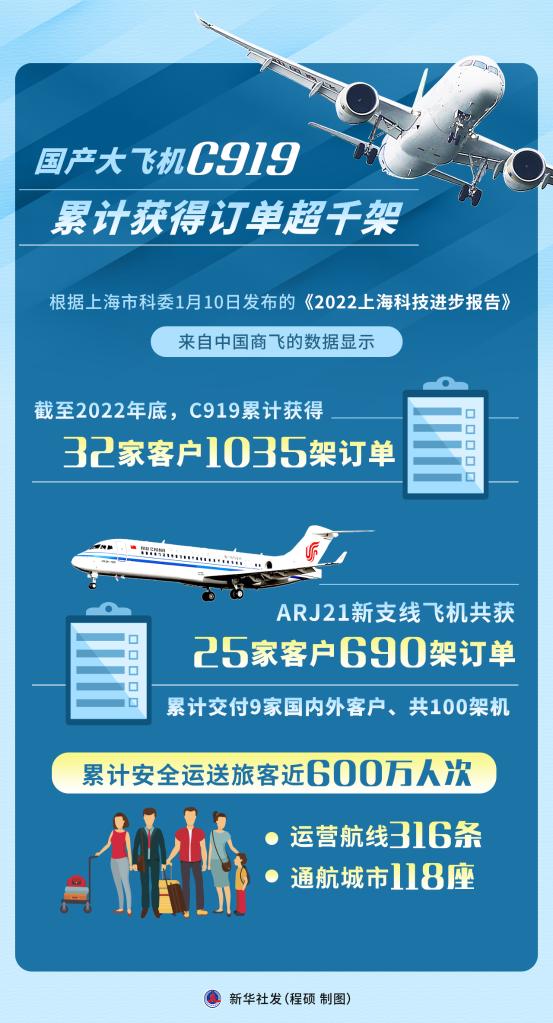 根據(jù)上海市科委1月10日發(fā)布的《2022上海科技進步報告》,來自中國商飛的數(shù)據(jù)顯示,2022年12月,C919大型客機首架機交付首家用戶東方航空公司,邁出市場運營“第一步”。截至2022年底,C919累計獲得32家客戶1035架訂單。