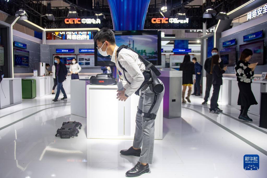在浙江烏鎮(zhèn)舉辦的2022年“互聯(lián)網(wǎng)之光”博覽會上,中國電科工作人員為觀眾演示外骨骼機器人的使用(2022年11月8日攝)。新華社記者 江漢 攝