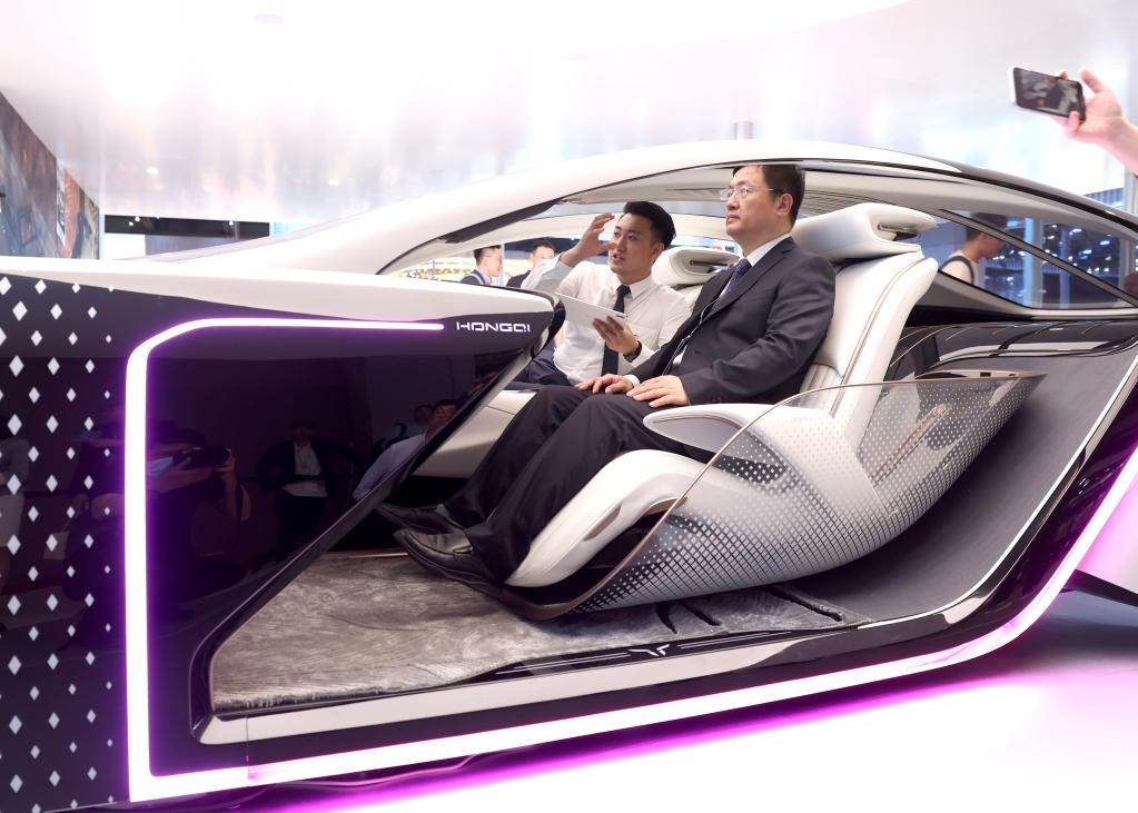 4月18日,觀眾在上海車展一汽展臺體驗(yàn)智能座艙。新華社記者陳建力 攝