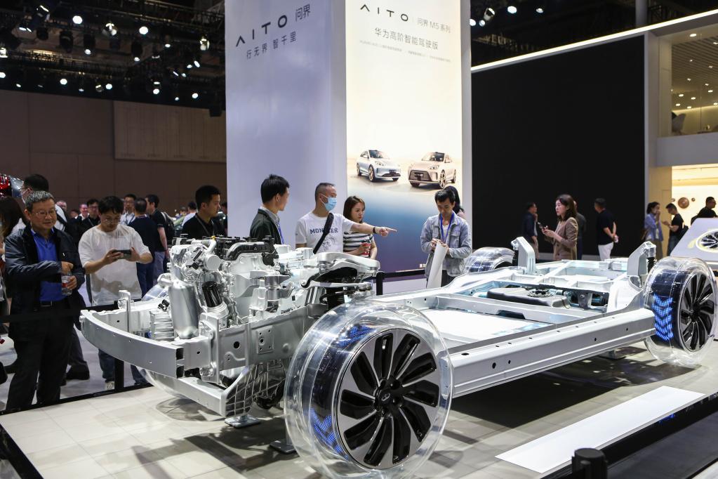 4月18日,參觀者在上海車展上觀看問界M5系列智能增程四驅(qū)平臺。新華社記者辛夢晨 攝