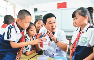近日,在貴州省黔東南苗族侗族自治州從江縣城關(guān)第三小學(xué),眼科醫(yī)生給學(xué)生講解健康用眼知識。石宏輝攝(人民視覺)