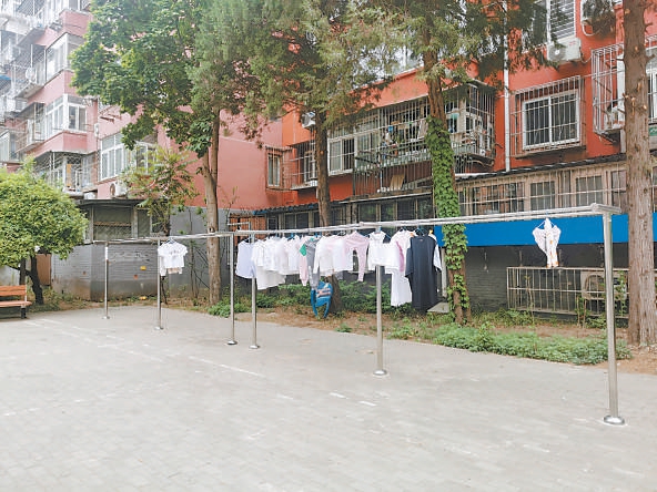 走出古城南路社區(qū)東門(mén),沿古城東街北行400余米右轉(zhuǎn)進(jìn)入八角北路社區(qū),只見(jiàn)幾株高大的國(guó)槐及道邊的綠藤錯(cuò)落有致。再向里走,是一塊寬闊的活動(dòng)場(chǎng)地,北側(cè)建有一排不銹鋼晾衣架,架上晾滿了衣服。“有居民提出家里陽(yáng)臺(tái)上晾衣服不方便,我們特地尋找合適地方,為這些社區(qū)建了晾衣架。”北京石房物業(yè)有限公司(以下簡(jiǎn)稱石房物業(yè))副經(jīng)理孫偉說(shuō)。