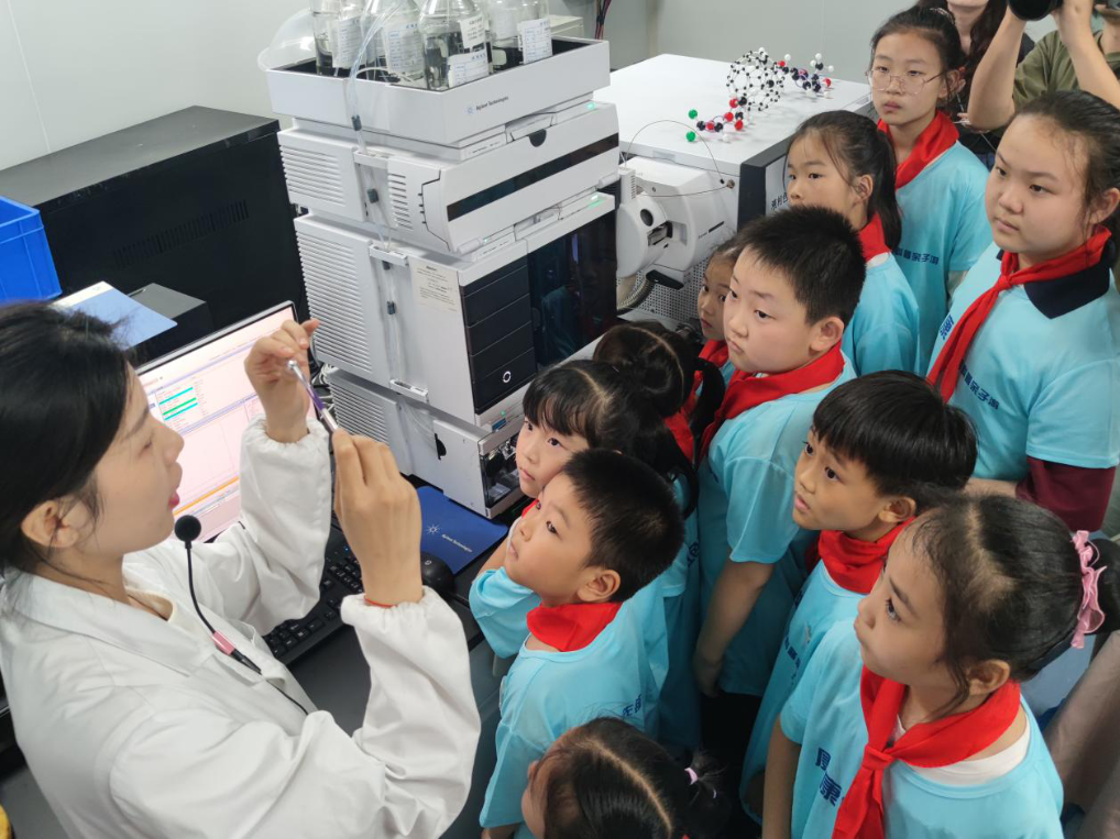 7月11日,在武漢市食品化妝品檢驗(yàn)所,工作人員向孩子們展示食品檢測(cè)過程。 (武漢市市場(chǎng)監(jiān)督管理局供圖)