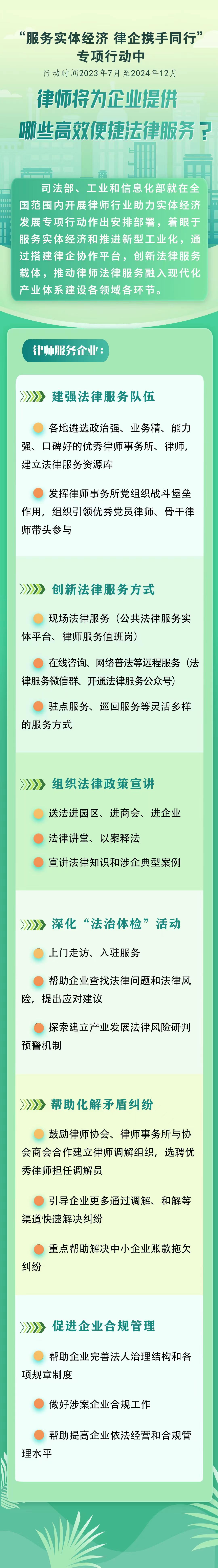 方案要求,各地司法行政部門、工業(yè)和信息化主管部門、通信管理局和律師協(xié)會要共同組織優(yōu)秀律師事務(wù)所和律師,為工業(yè)和信息化領(lǐng)域相關(guān)企業(yè)提供全業(yè)務(wù)、全時空、高效便捷的法律服務(wù)?;顒又?,要摸清各類企業(yè)法律服務(wù)需求,建強(qiáng)法律服務(wù)隊(duì)伍,創(chuàng)新法律服務(wù)方式,通過開展法律政策宣講、深化“法治體檢”活動等形式,推動律師行業(yè)服務(wù)實(shí)體經(jīng)濟(jì)的廣度和深度不斷拓展,服務(wù)的專業(yè)性、精準(zhǔn)性、便捷性、實(shí)效性不斷增強(qiáng),幫助企業(yè)化解法律風(fēng)險(xiǎn),解決法律問題,維護(hù)合法權(quán)益,提升依法合規(guī)經(jīng)營管理水平。