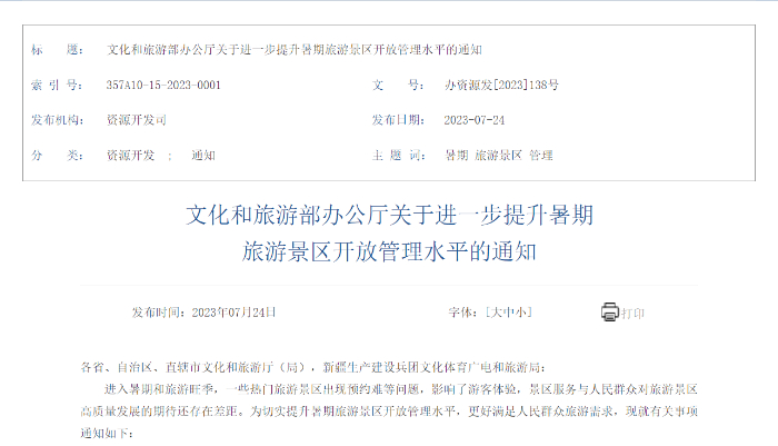 通知中稱,進入暑期和旅游旺季,一些熱門旅游景區(qū)出現預約難等問題,影響了游客體驗,景區(qū)服務與人民群眾對旅游景區(qū)高質量發(fā)展的期待還存在差距。為切實提升暑期旅游景區(qū)開放管理水平,更好滿足人民群眾旅游需求,現就有關事項通知如下: