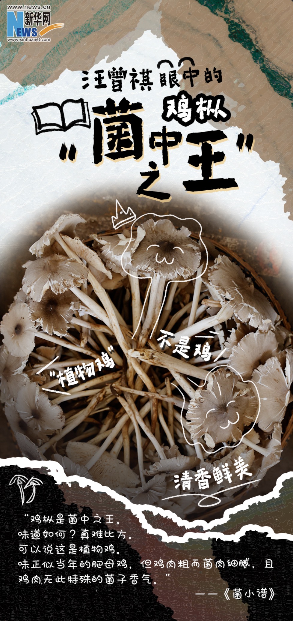 雞樅是當之無愧的菌中之王,味道鮮濃,無可方比。在《昆明的吃食》一文中,汪曾祺記錄下了許多他鐘愛的美食。談及雞樅,他說:“雞樅有一股清香,入口無渣,甚滑。”在品嘗雞樅后,更是用“腴”一字概括雞樅的鮮美口感。