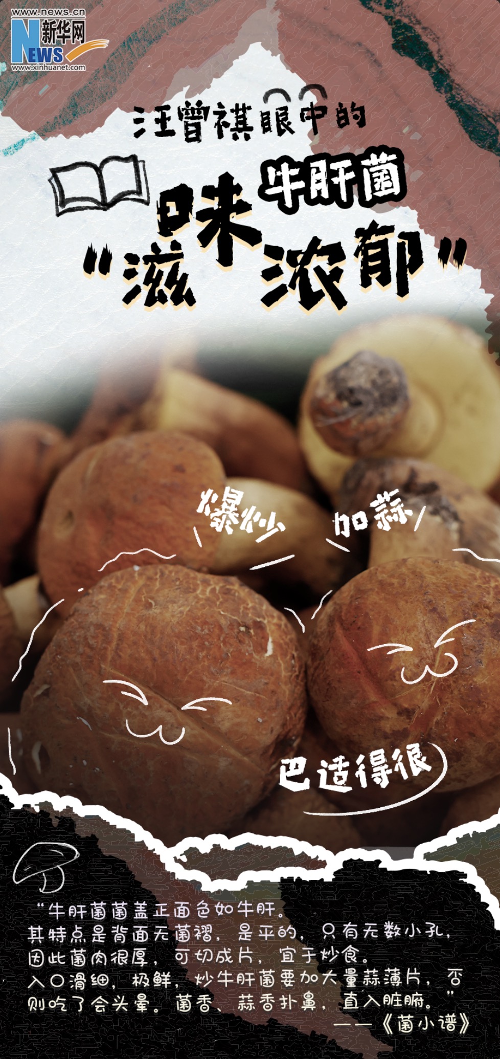 牛肝菌,色如牛肝,滑、嫩、鮮、香,較之于其他菌,肥碩鮮美,滋味濃郁,吃起來有肉的質感,聞起來有土壤的清香。但是牛肝菌迷人也危險,在炒熟的情況下,汪老建議“炒牛肝菌須多放蒜”。