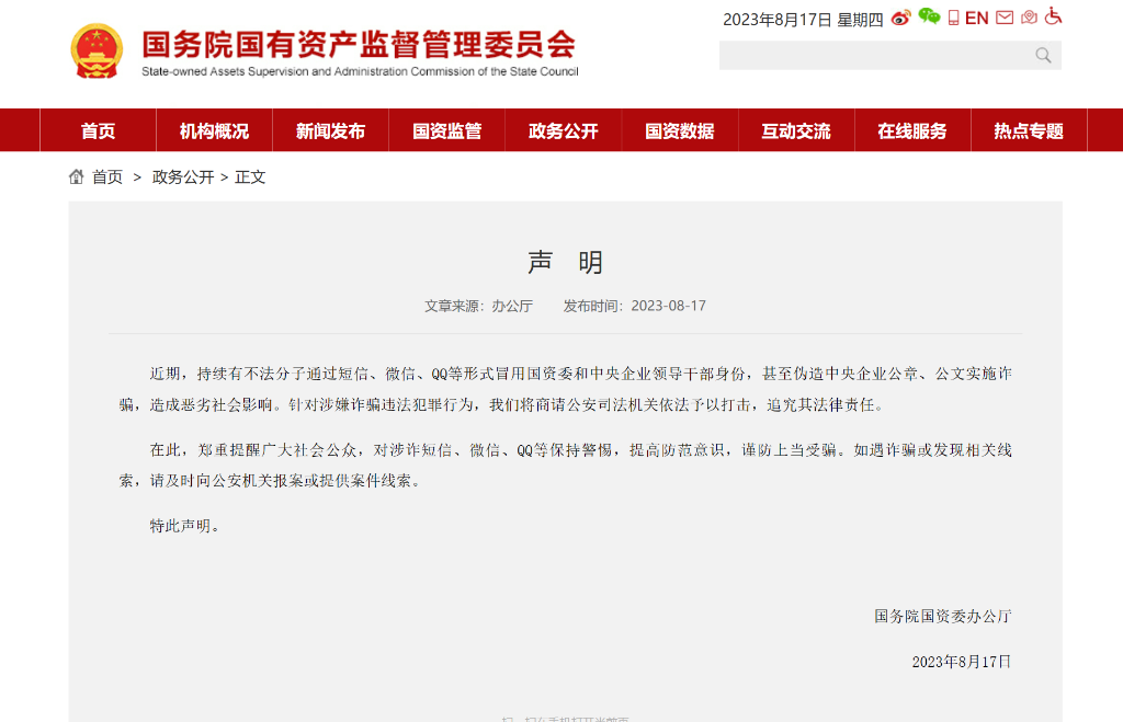 國(guó)務(wù)院國(guó)資委辦公廳8月17日在國(guó)務(wù)院國(guó)資委官網(wǎng)發(fā)布聲明稱,近期,持續(xù)有不法分子通過短信、微信、QQ等形式冒用國(guó)務(wù)院國(guó)資委和中央企業(yè)領(lǐng)導(dǎo)干部身份,甚至偽造中央企業(yè)公章、公文實(shí)施詐騙,造成惡劣社會(huì)影響。針對(duì)涉嫌詐騙違法犯罪行為,國(guó)務(wù)院國(guó)資委將商請(qǐng)公安司法機(jī)關(guān)依法予以打擊,追究其法律責(zé)任。