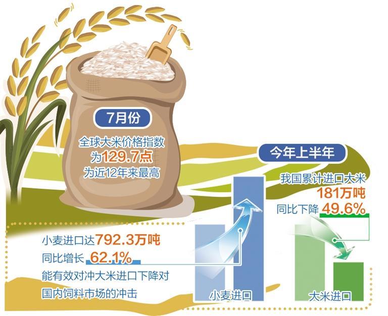 “為了確保大米進(jìn)口穩(wěn)定性,我國(guó)各類進(jìn)口主體也在推進(jìn)大米進(jìn)口多元化,避免來源地和品種過于集中帶來的進(jìn)口安全風(fēng)險(xiǎn)。”彭超說。一方面,推進(jìn)大米進(jìn)口來源地多元化。我國(guó)大米進(jìn)口來源地包括越南、緬甸、泰國(guó)、印度、巴基斯坦、柬埔寨等主產(chǎn)國(guó)。從去年10月起,我國(guó)開始逐步減少印度碎米進(jìn)口,印度已從過去幾年中國(guó)最大的大米供應(yīng)商滑落至第四位。另一方面,推進(jìn)糧食進(jìn)口品種多元化。減少大米進(jìn)口的同時(shí),增加飼用小麥進(jìn)口。今年上半年,我國(guó)小麥進(jìn)口量達(dá)到792.3萬噸,較去年同期增長(zhǎng)62.1%,能夠有效對(duì)沖大米進(jìn)口下降對(duì)國(guó)內(nèi)飼料市場(chǎng)的沖擊。