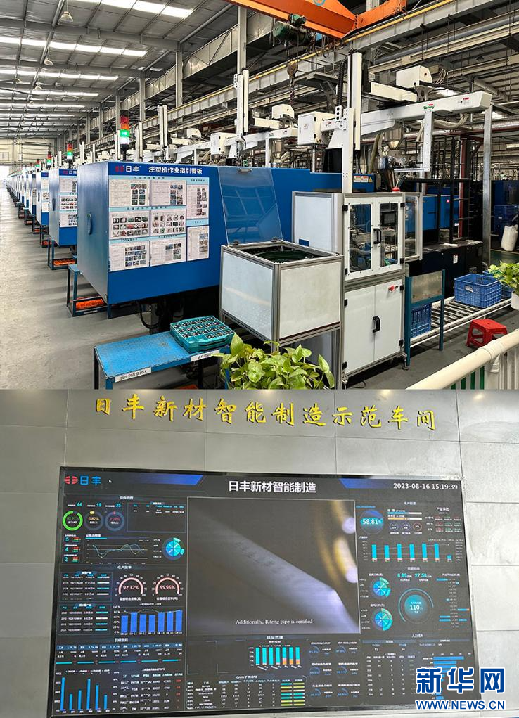 上圖為日豐工廠注塑車間生產(chǎn)線;下圖為日豐綜合管理云平臺。新華網(wǎng) 關(guān)錦恒 攝