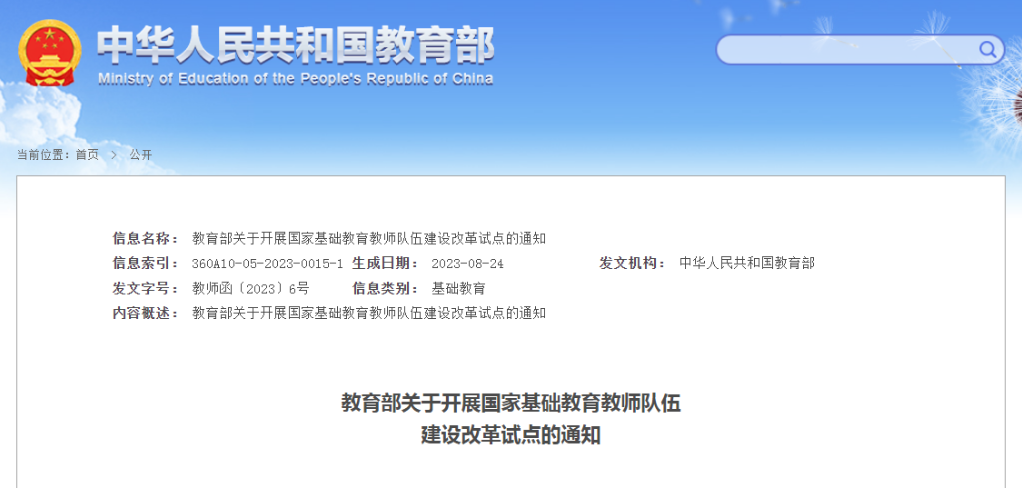 記者8月29日從教育部獲悉,教育部近日印發(fā)《教育部關(guān)于開展國(guó)家基礎(chǔ)教育教師隊(duì)伍建設(shè)改革試點(diǎn)的通知》,部署在上海市、山東省、青海省、福建省廈門市、湖南省常德市、黑龍江省黑河市嫩江市、浙江省溫州市甌海區(qū)、河南省商丘市永城市、廣西壯族自治區(qū)桂林市荔浦市、重慶市云陽縣等省、市、縣10個(gè)地區(qū)開展國(guó)家基礎(chǔ)教育教師隊(duì)伍建設(shè)改革試點(diǎn)。試點(diǎn)時(shí)間自通知印發(fā)之日起計(jì)算,周期3年。