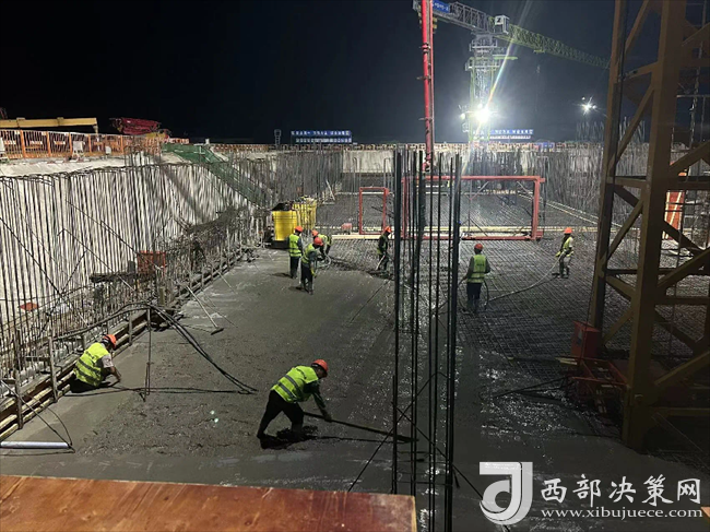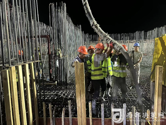 九層之臺(tái),始于壘土。筏板作為基礎(chǔ)工程最重要的組成部分,其質(zhì)量的好壞直接影響到上部結(jié)構(gòu)的穩(wěn)固性。在完成筏板鋼筋綁扎后,2臺(tái)長(zhǎng)臂泵車、34輛混凝土罐車開(kāi)始送料。澆筑期間,映入眼簾的是一片繁忙之景,22名管理人員,110余名勞務(wù)人員正以時(shí)不我待的緊迫感,全力以赴抓緊抓實(shí)項(xiàng)目建設(shè),共同助力項(xiàng)目建設(shè)跑出加速度。