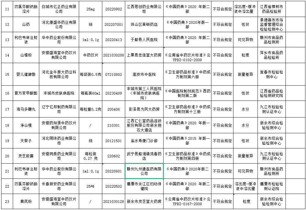 為加強(qiáng)藥品質(zhì)量監(jiān)管,保障公眾用藥安全,根據(jù)《中華人民共和國藥品管理法》及相關(guān)法律法規(guī)和江西省藥品抽檢計(jì)劃,我省各級(jí)藥品監(jiān)管部門和檢驗(yàn)機(jī)構(gòu)對(duì)全省藥品生產(chǎn)、經(jīng)營和使用單位實(shí)施了監(jiān)督抽檢?,F(xiàn)將本期藥品抽檢信息通報(bào)如下: