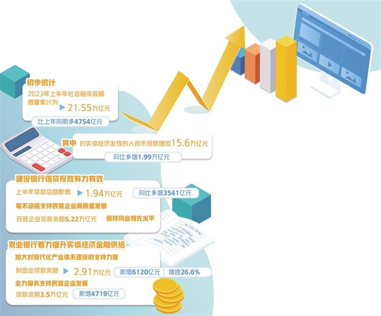 今年上半年以來,金融持續(xù)支持實(shí)體經(jīng)濟(jì)恢復(fù)發(fā)展和回升向好,金融體系對實(shí)體經(jīng)濟(jì)的支持進(jìn)一步加大。初步統(tǒng)計(jì),2023年上半年社會融資規(guī)模增量累計(jì)為21.55萬億元,比上年同期多4754億元。其中,對實(shí)體經(jīng)濟(jì)發(fā)放的人民幣貸款增加15.6萬億元,同比多增1.99萬億元。
