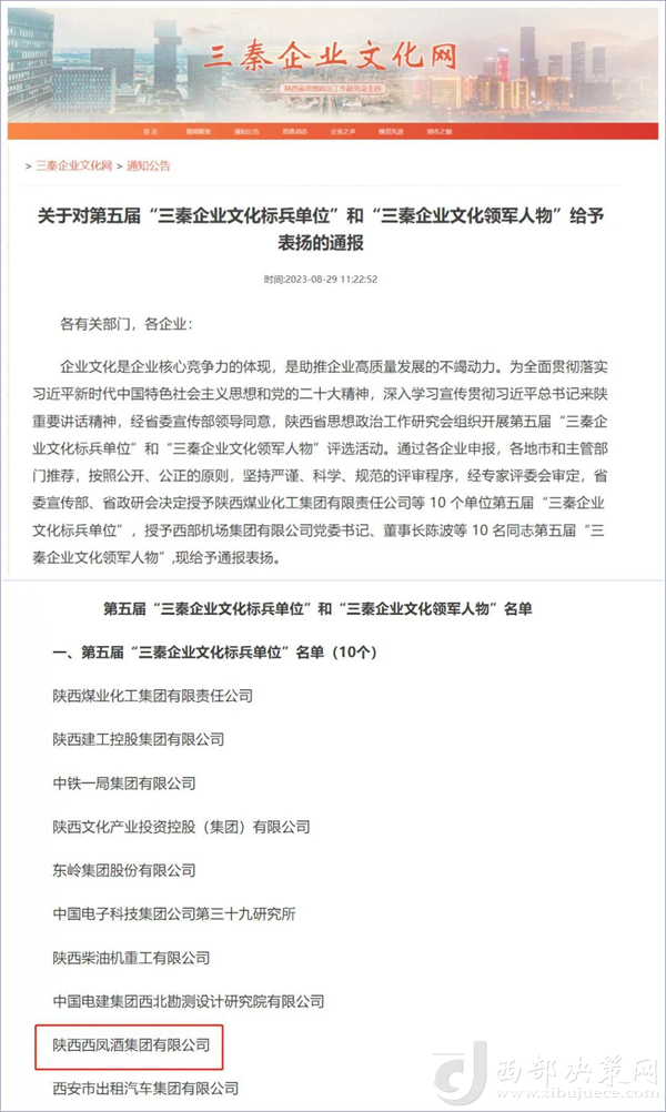 西部決策網(wǎng)訊(記者劉玉 韓宗憲 通訊員 馬迪)近日,從陜西省委宣傳部、陜西省思想政治工作研究會(huì)傳來(lái)喜訊,西鳳集團(tuán)公司以在企業(yè)文化建設(shè)方面的突出成績(jī),從眾多評(píng)選單位中脫穎而出,獲得“三秦企業(yè)文化標(biāo)兵單位”光榮稱號(hào)。