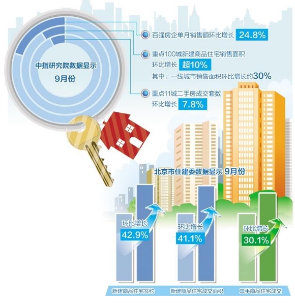 隨著需求釋放動(dòng)能減弱,9月后兩周成交量明顯下降。北京市住建委數(shù)據(jù)顯示,9月份,北京新建商品住宅簽約5891套,成交面積67.96萬平方米,環(huán)比分別增長42.9%和41.1%;二手商品住宅成交14262套,環(huán)比增長30.1%。
