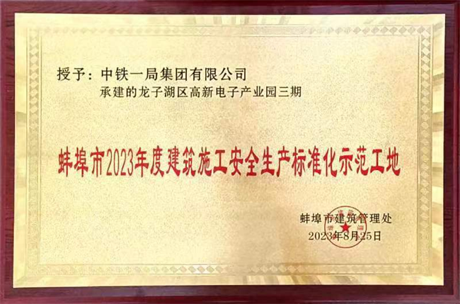 近日,中鐵一局蚌埠龍子湖區(qū)高新電子產(chǎn)業(yè)園EPC三期項(xiàng)目收到蚌埠市建筑管理處授予的“蚌埠市2023年度建筑施工安全生產(chǎn)標(biāo)準(zhǔn)示范化工地”榮譽(yù)匾。