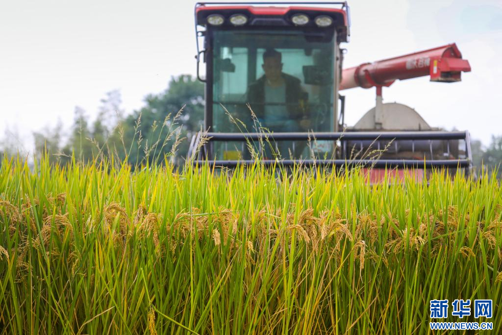 進(jìn)入豐收期,村民駕駛收割機(jī)收割水稻。