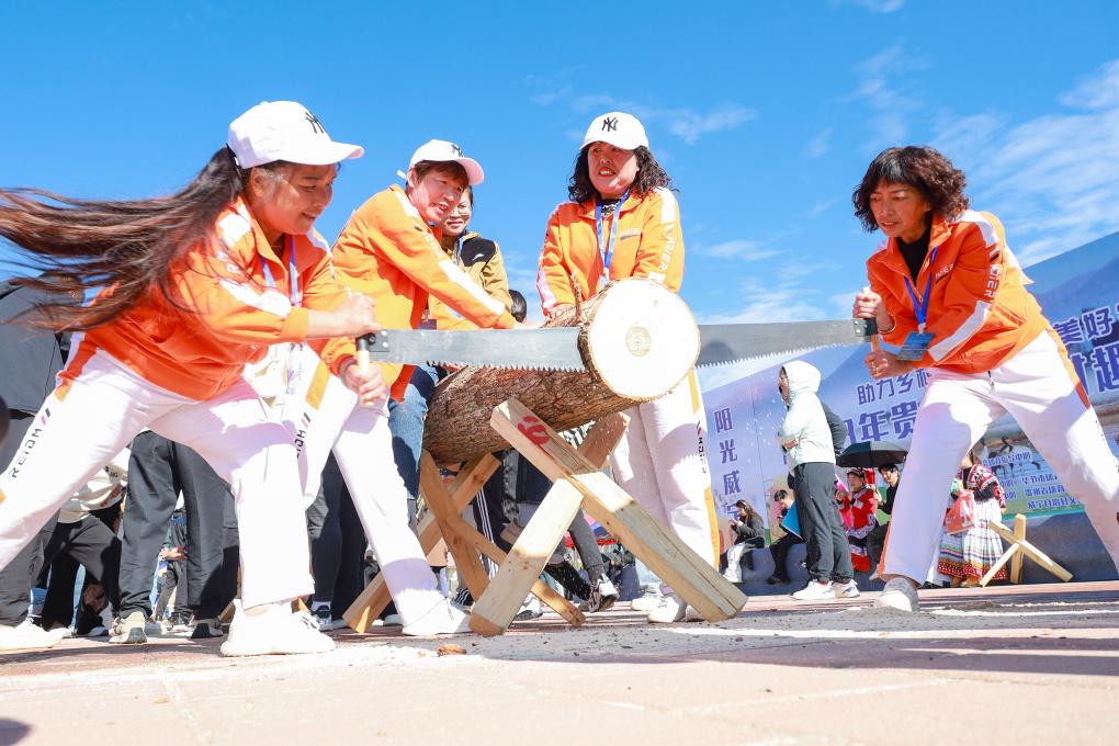 上午9點(diǎn),整個(gè)運(yùn)動(dòng)會(huì)在“同心鋸木”比賽中拉開(kāi)序幕。只見(jiàn)參賽選手兩兩一組,有節(jié)奏地一拉一推,木塊隨之落下。賽場(chǎng)上,參賽選手揮汗如雨,賽場(chǎng)邊加油聲、喝彩聲此起彼伏。