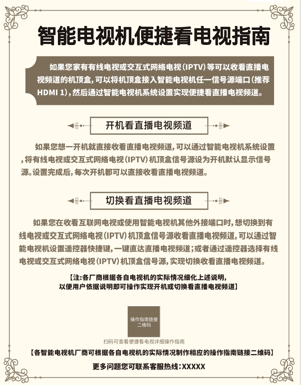 記者11月10日從國家廣播電視總局獲悉,根據(jù)治理電視“套娃”收費和操作復雜工作部署要求,國家廣播電視總局、工業(yè)和信息化部、國家市場監(jiān)督管理總局、中國消費者協(xié)會決定開展電視收看“明白卡”提示工作。自2023年11月起,各電視機生產廠商要將制作完成的《電視收看“明白卡”》裝入電視機包裝箱內的說明材料中,同時在電商銷售頁面、線下實體銷售和廠商入戶安裝電視機過程中,將“明白卡”內容向用戶明確展示,并告知用戶只有開通有線電視或IPTV方可收看電視直播頻道節(jié)目。(記者王鵬)