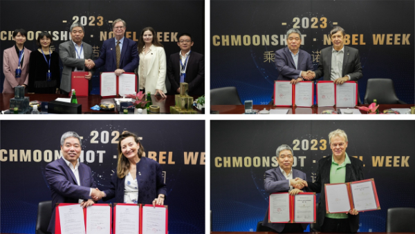 上海細(xì)胞治療集團(tuán)董事長(zhǎng)錢其軍與諾獎(jiǎng)獲得者喬治·斯穆特教授、安德烈·海姆教授及莫澤夫婦亮相“乘黃計(jì)劃諾獎(jiǎng)推廣大使”簽約現(xiàn)場(chǎng)
