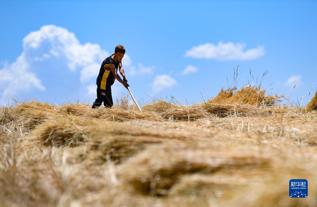 7月3日,寧夏固原市原州區(qū)炭山鄉(xiāng)炭山村村民在整理麥稈。新華社記者 馮開(kāi)華 攝