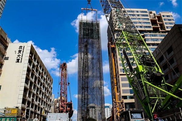 作為最能說(shuō)明項(xiàng)目部可以在“瓷器店里打老鼠”的施工,就是維也納酒店門前下放地下連續(xù)墻鋼筋籠。大家知道,車站的地連墻是保證地鐵車站安全的基礎(chǔ)和關(guān)鍵。如前所述,深圳地鐵11號(hào)線中大八院站是在窄小空間里“舞刀弄棒”,而南翼的維也納酒店門廳檐角在空間侵入地連墻,導(dǎo)致有4幅地連墻無(wú)法正常施工。項(xiàng)目部以?shī)溟W為首的管理團(tuán)隊(duì),組織技術(shù)骨干,反復(fù)研討、比選方案,確定采用“低凈空成槽設(shè)備成槽,鋼筋籠分片槽內(nèi)平移施工技術(shù)”方案。在鋼筋籠入槽時(shí),履帶吊“上提、前進(jìn)、轉(zhuǎn)臂、下放”等平穩(wěn)操作,將每片長(zhǎng)約35米、重約30噸鋼筋籠下放到槽內(nèi)。下放鋼筋籠時(shí),籠體距離門廳最小距離僅有3厘米,實(shí)現(xiàn)了對(duì)門廳“零碰撞、零剮蹭”。該施工技術(shù)為深圳地鐵施工首例。