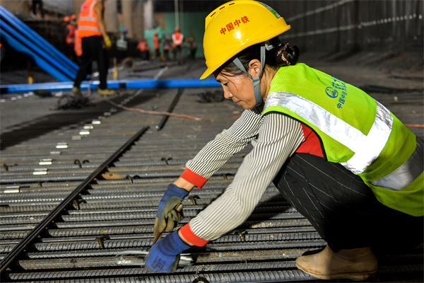 在1號(hào)工點(diǎn)的第3層基坑里,東邊,10幾名穿著印有工種名稱的反光馬甲的工人正忙著安裝模板鋼支撐;西邊,20幾名同樣穿著馬甲的工人,或綁扎鋼筋,或轉(zhuǎn)運(yùn)鋼筋,或焊接鋼筋……一派忙而有序的大干場(chǎng)面。在3號(hào)工點(diǎn)地面,華燈初上,1臺(tái)吊車,4、5名鋼筋工、電焊工也在忙個(gè)不停……