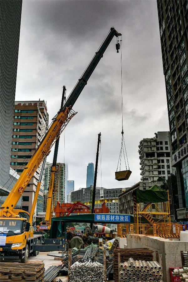 我們?cè)谧鳛楫?dāng)下施工主戰(zhàn)場(chǎng)的2號(hào)工點(diǎn)地面東邊施工現(xiàn)場(chǎng)看到,沒有明顯標(biāo)識(shí)卻能一眼分辨的“迷你”鋼筋加工場(chǎng)里,7、8名穿著“鋼筋工”馬甲的工人,或給鋼筋套絲,或彎制鋼筋構(gòu)件,或忙著調(diào)運(yùn)鋼筋捆……忙而不亂;在西邊,一臺(tái)抓斗機(jī)把土方從基坑里提出來(lái)放入旁邊的鐵鐵質(zhì)料斗箱里,一臺(tái)挖掘機(jī)又將箱里的土轉(zhuǎn)倒裝在運(yùn)土車?yán)?,土裝滿后鏟斗又將土壓實(shí)、將車幫上緣的土刮干凈,防止土在運(yùn)輸中掉落……