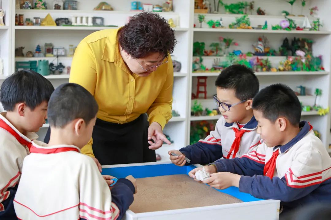 心理教師在心理輔導室陪學生一起擺放沙盤 / 陳為 攝