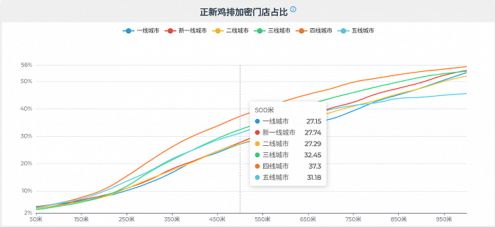 從極海品牌監(jiān)測(cè)的數(shù)據(jù)來看,在門店占比超過50%的三四五線城市里,正新門店位于“已有門店周圍500米”距離的“加密門店”的占比都超過30%,其中,四線城市甚至超過37%。在深圳,界面新聞留意到,在華強(qiáng)北附近,也依然存在正新雞排相距100米“緊挨”著開店的現(xiàn)狀。