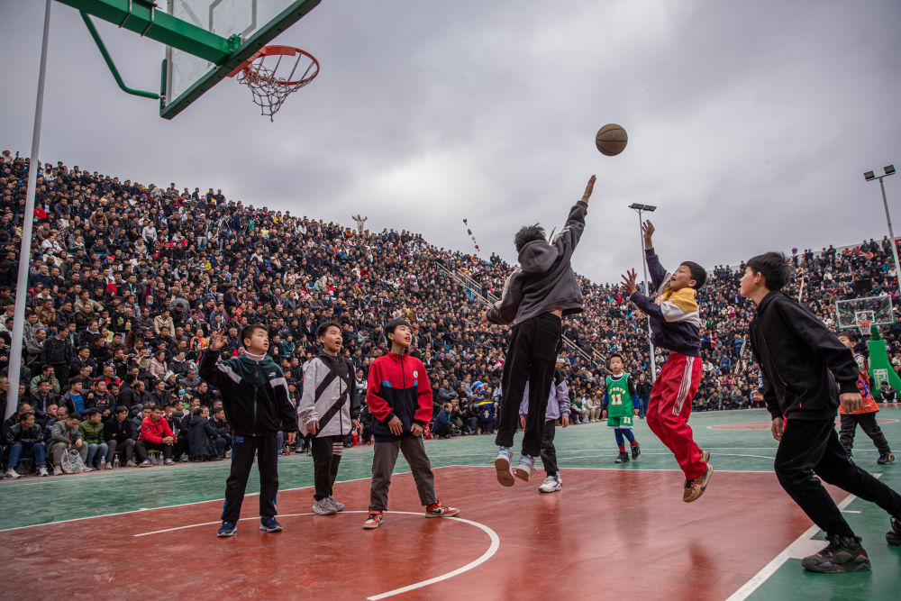 ↑貴州省黔東南州臺江縣臺盤村的小朋友在比賽前打籃球(3月25日攝)。當(dāng)日,貴州省首屆“美麗鄉(xiāng)村”籃球聯(lián)賽總決賽在臺盤村開打。