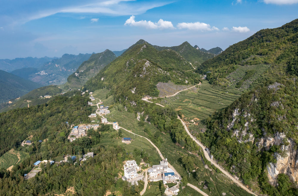 ↑云南省文山壯族苗族自治州西疇縣山間公路,右側(cè)這條是巖頭村村民小組長李華明帶領(lǐng)群眾修建的最后一公里進(jìn)村道路(無人機(jī)照片,7月26日攝)。