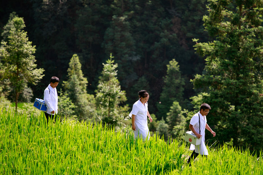 ↑貴州省黔東南苗族侗族自治州榕江縣忠誠鎮(zhèn),村醫(yī)吳昌喜(左)、吳濤(右)、項(xiàng)昌會走在榕江縣忠誠鎮(zhèn)定弄村郊外的田埂上(8月16日攝)。吳昌喜和兒子吳濤、兒媳項(xiàng)昌會都是村醫(yī),呵護(hù)著三個(gè)村820多戶、3660多名群眾的健康。