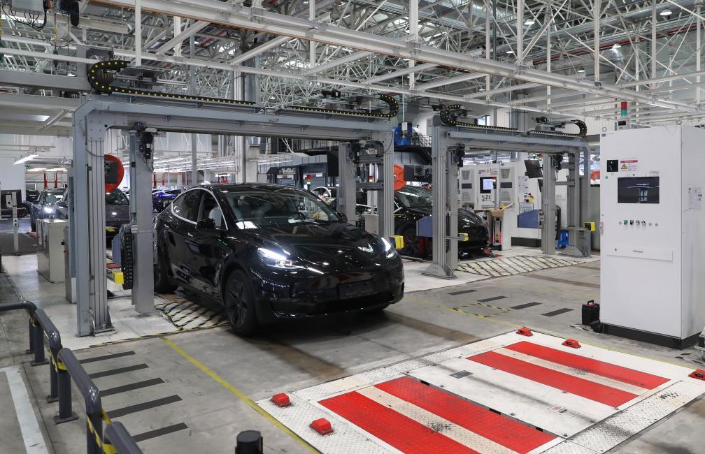 12月22日,在特斯拉上海超級工廠內(nèi),一輛特斯拉電動(dòng)汽車在進(jìn)行出廠前的車載電子設(shè)備檢測。新華社記者方喆 攝