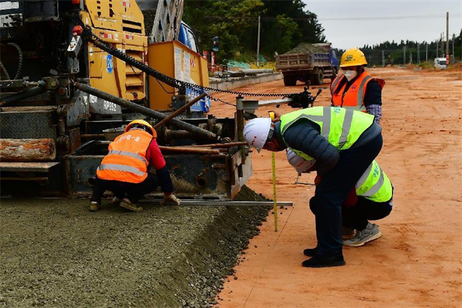 筆者在現(xiàn)場看到,運輸車將水穩(wěn)料緩緩倒入攤鋪機料斗里,2名司機開著攤鋪機緩緩前行,現(xiàn)場管理人員和作業(yè)人員互相配合,不時測量著攤鋪厚度……攤鋪到了50米左右,壓路機開始進(jìn)行碾壓作業(yè)……