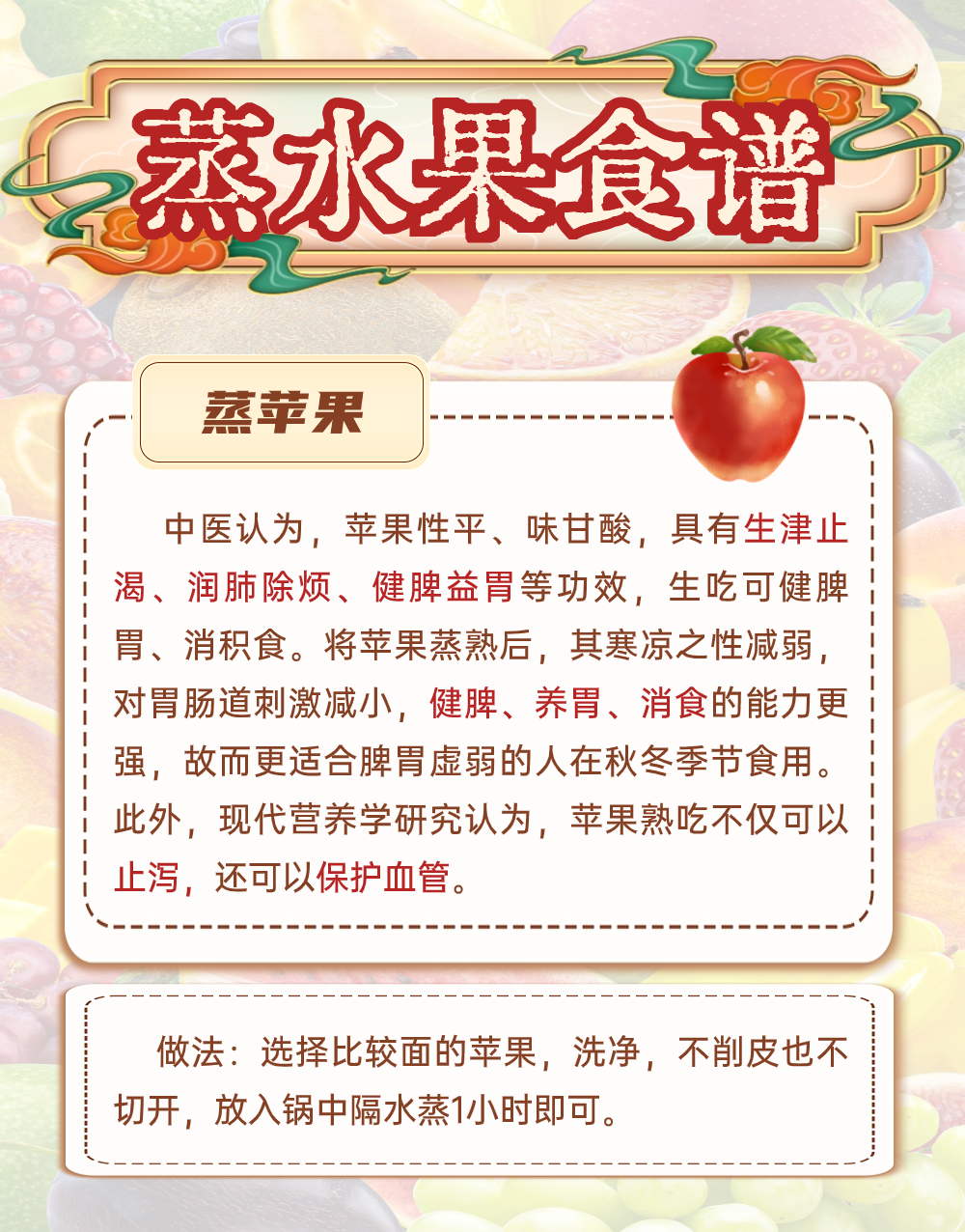那么,應(yīng)該怎樣蒸水果呢?不同水果蒸著吃,對健康有哪些好處呢?請收好這份蒸水果食譜。(記者 雷妍 實習(xí)記者 王佳路)