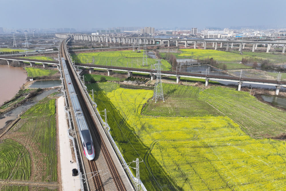 2024年3月2日,一輛高鐵列車從江西省南昌市南昌縣一處油菜花田旁駛過(guò)(無(wú)人機(jī)照片)。新華社記者 金良快 攝
