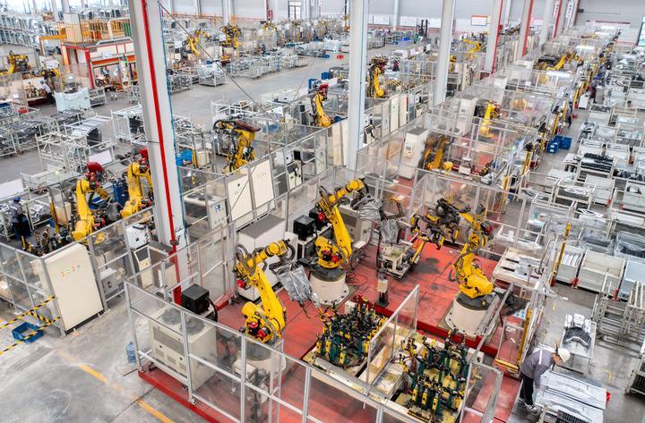 2024年1月8日,在位于浙江省湖州市長(zhǎng)興經(jīng)濟(jì)技術(shù)開發(fā)區(qū)的長(zhǎng)興地通汽車部件有限公司,全自動(dòng)機(jī)器人高速運(yùn)轉(zhuǎn)生產(chǎn)新能源汽車配件訂單產(chǎn)品(無(wú)人機(jī)照片)。新華社發(fā)(譚云俸攝)