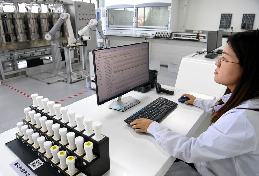 2024年2月28日,工作人員黨小梅在陜西榆林中科潔凈能源創(chuàng)新研究院基于人工智能的高通量催化反應(yīng)研究平臺(tái)實(shí)驗(yàn)室進(jìn)行實(shí)驗(yàn)。新華社記者 鄒競(jìng)一 攝