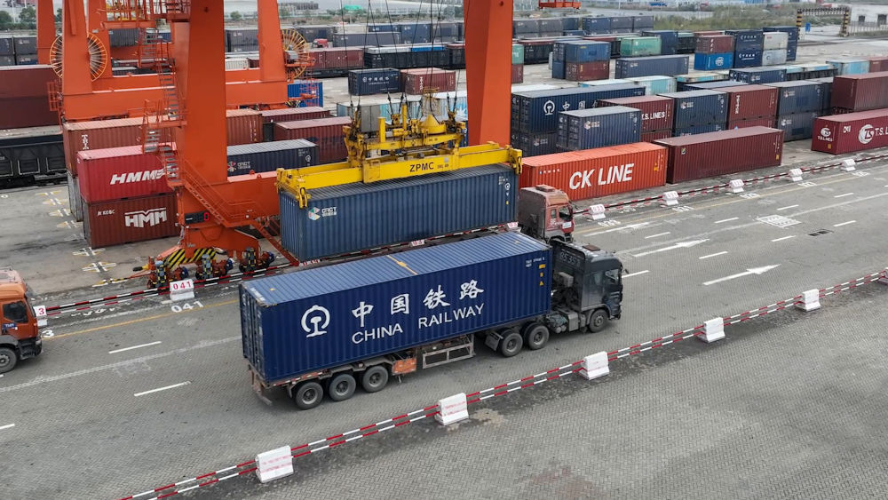 2024年3月1日,在天津港北疆港區(qū)C段智能化集裝箱碼頭,起重機(jī)搬運(yùn)集裝箱。新華社記者 單宇琦 攝