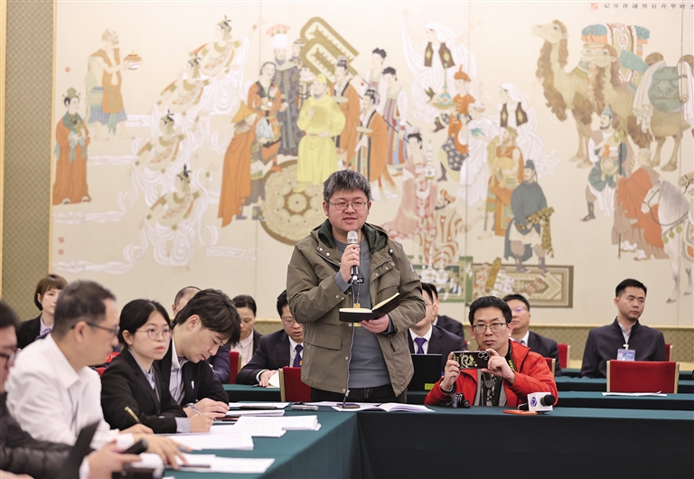 3月6日,中外媒體記者走進北京人民大會堂,參加十四屆全國人大二次會議陜西代表團媒體開放日活動。圖為記者向代表提問。記者 母家亮攝