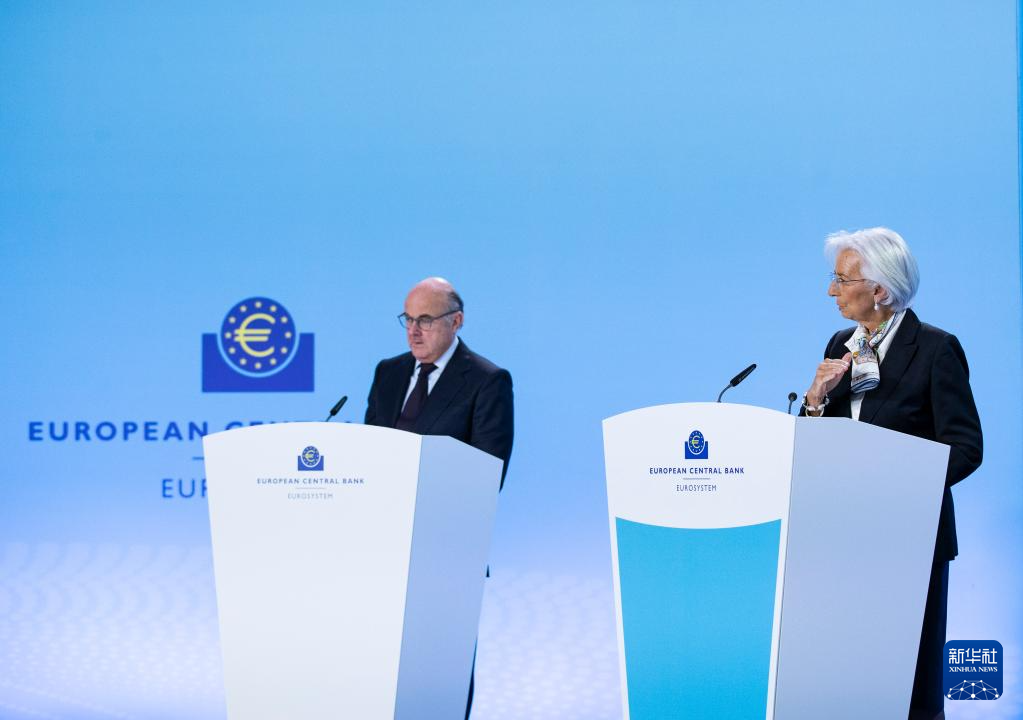 3月7日,歐洲中央銀行行長拉加德(右)在德國法蘭克福歐洲中央銀行總部舉行的新聞發(fā)布會上講話。歐洲中央銀行7日召開貨幣政策會議,決定繼續(xù)維持三大關(guān)鍵利率不變。新華社記者 張帆 攝