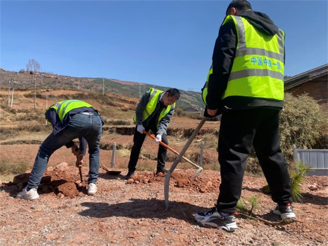 項目部提前準備好樹苗,大家來到拌合站的植樹現(xiàn)場,有拿鐵鍬的,有拿鋤頭的,互相配合,埋頭植樹,揮鍬鏟土,扶樹填土,澆水灑水,臉上洋溢著喜慶的笑容。